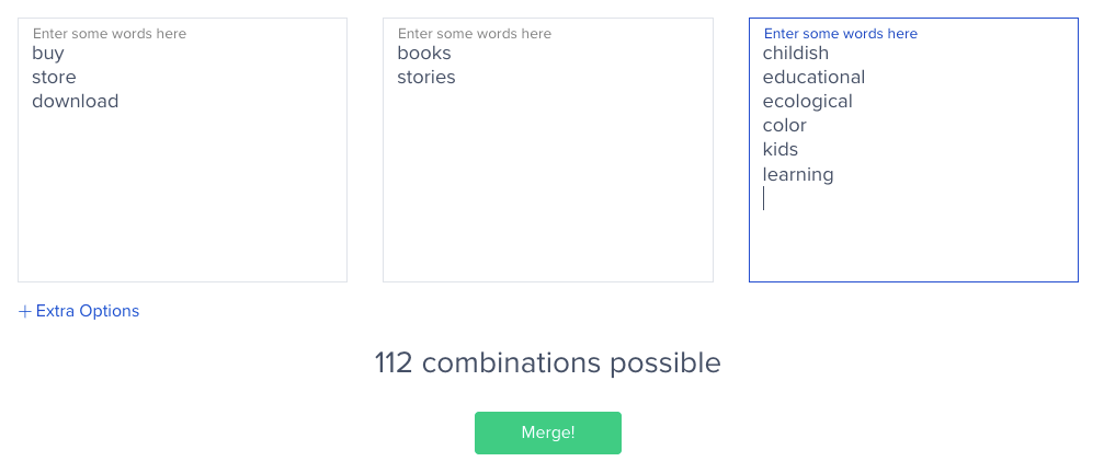 - Search Combination Tool : It is very similar to Merge Words, only this tool also suggests new terms that you could add to your list.